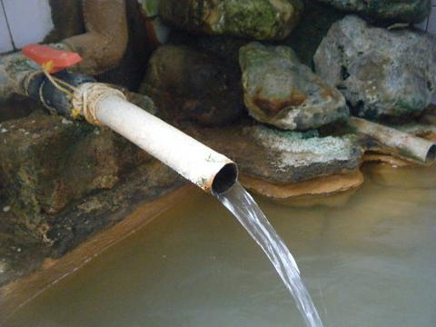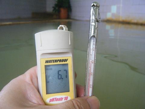 湯口から44度、pH6.0の源泉が約20ℓ/分ほど注いでいる。普段使用しているデジタル温度計は大船川に置き忘れたのでスペアの棒状温度計で代用する。知覚的には、金気炭酸・アブラ臭、金気・炭酸・塩味。
