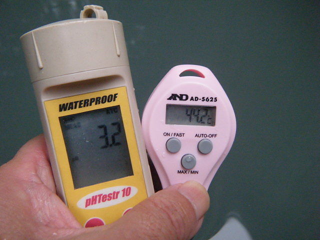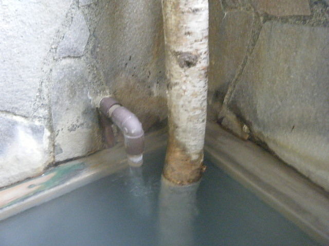 湯船の中ほどで、湯温44.4℃、pH3.3を計測。溢れた湯は湯縁からオーバーフローしている。湯張り時に適温にするために加水している。営業中は基本的に加水蛇口を閉めているが、湯客が加水する可能性有り。源泉(加水)かけ流しと追認。さらりとしたつるすべの浴感あり。湯客が加水しなければ、夏季の実勢温度は44℃を越えるだろう。