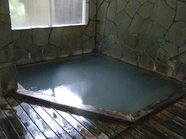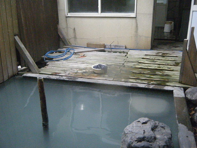 灰白色の濁り湯で白っぽい湯の華が漂っている。真ん中にある棒は湯抜き栓。湯口は湯底にあるようだが、側壁、岩周辺を這いずり回って探すが発見できず。女湯を探すわけにもいかずやむをえず諦める。