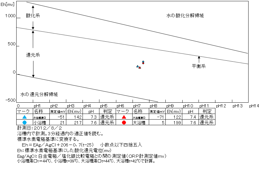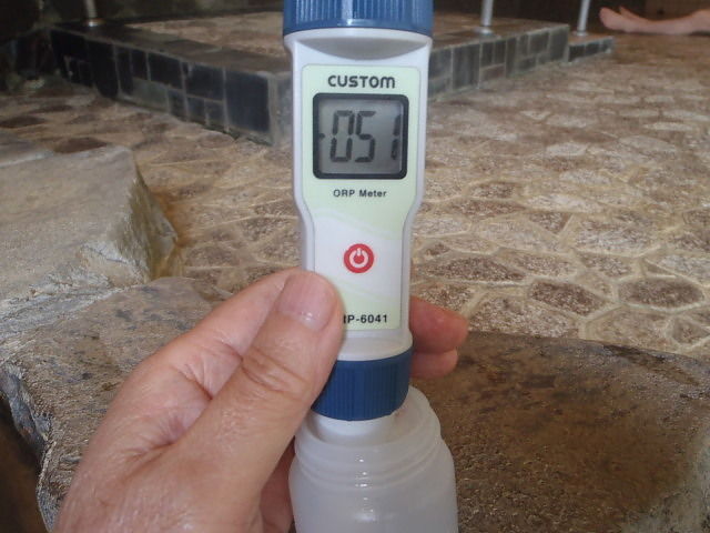 湯口:44.4℃、pH7.3、ORP値は-51mvに収束した。