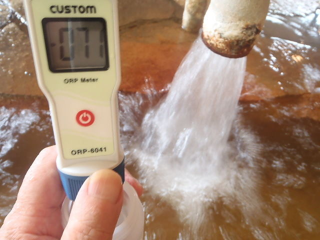 湯口:44.5℃、pH7.4、ORP値は-71mvに収束した。