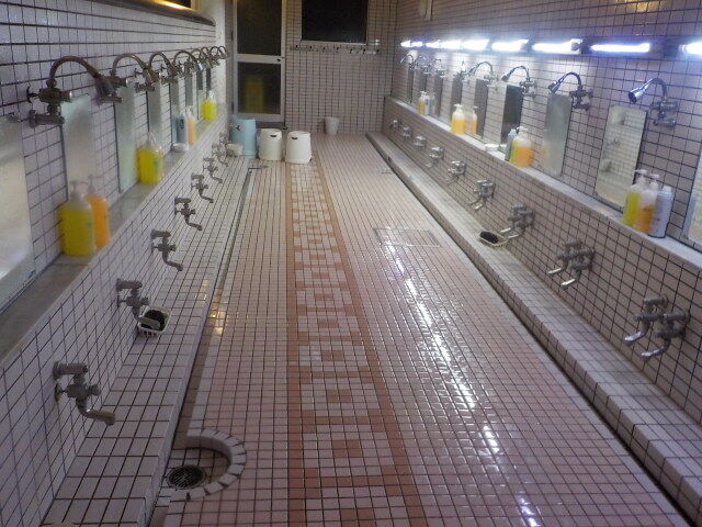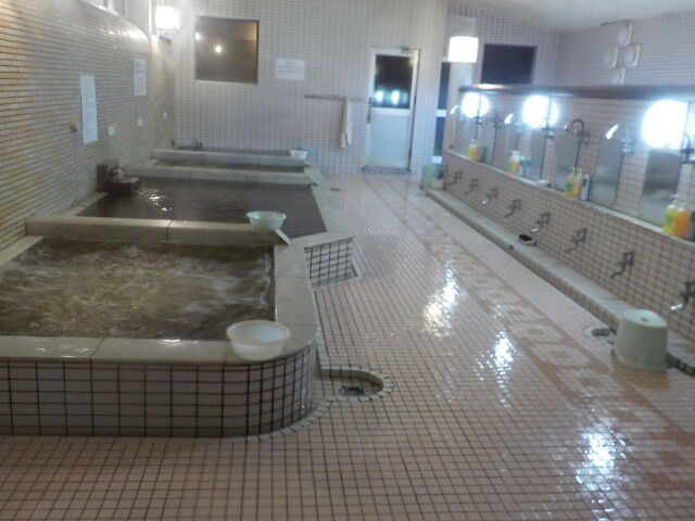 タイル張りの浴室に、主浴槽、バイブラ、ジェットバス、水風呂、高温サウナ、スチームサウナ(休止)、ボディシャワー(使用不可)、上がり湯、シャワー付カラン26台配置。旧式シャワーは押しボタンを離すとすぐに止まってしまうので片手で押しながら洗う。シャンプー・ボディソープあり。別料金のアカスリエステコーナーもある。