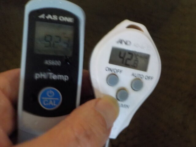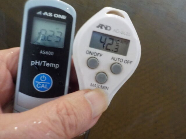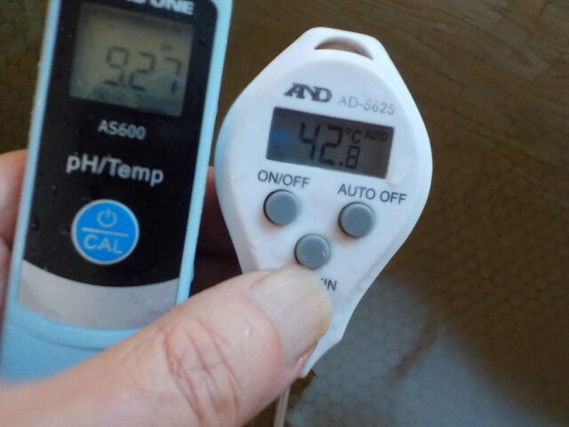 浴槽:温度42.8℃、pH9.23、ORP値は-143mvに収束した。