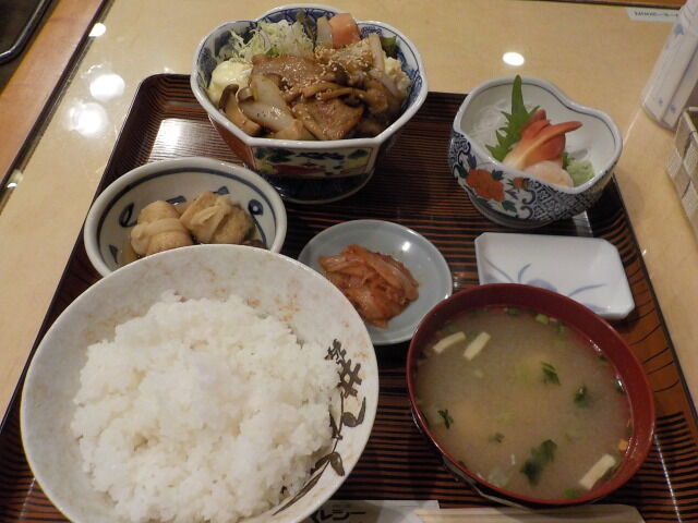 夕食は定食。豚の生姜焼き(サラダ付)、刺身、ほうれん草のお浸し、ご飯、味噌汁、漬物。