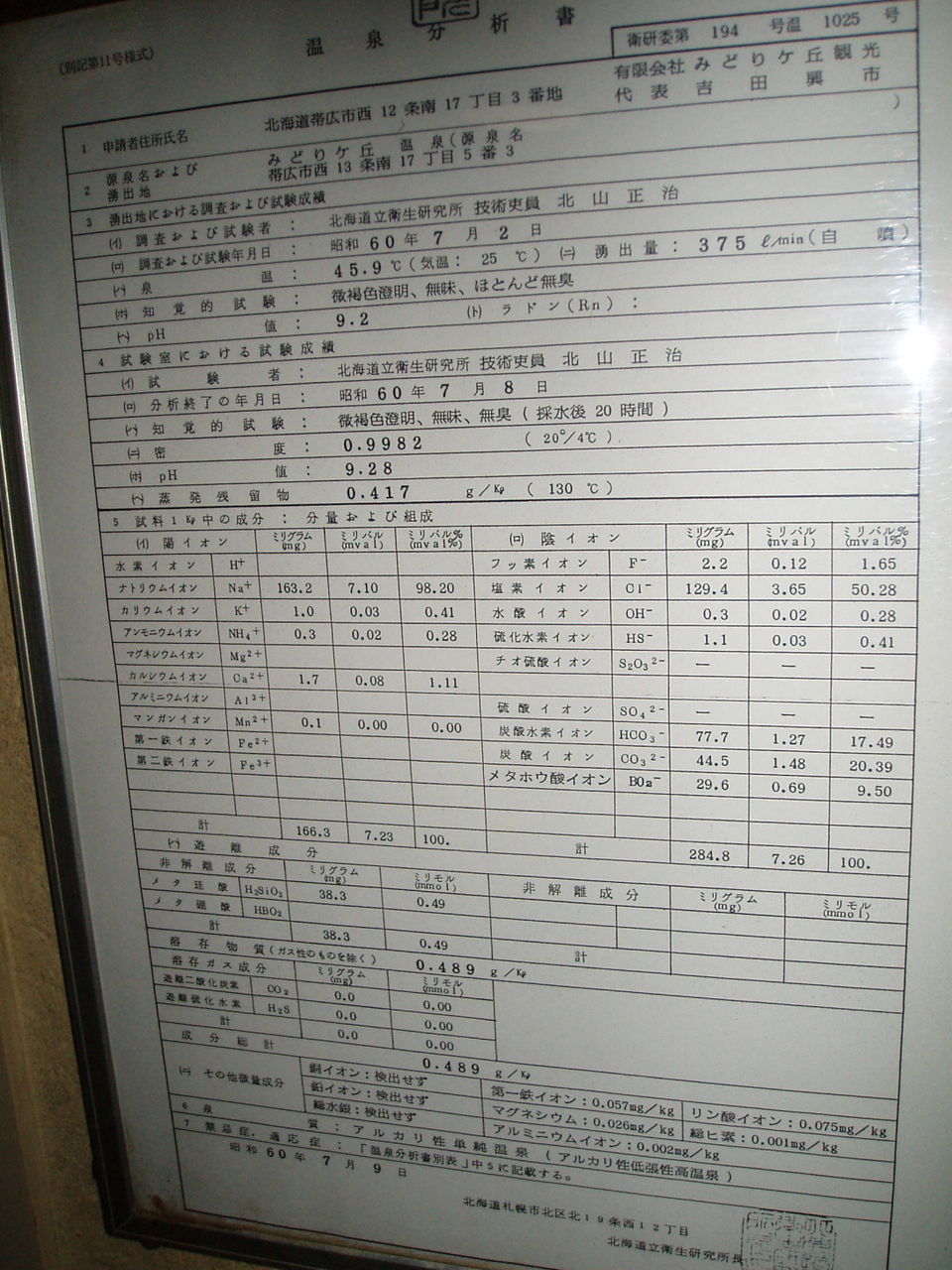 平成21年4月27日に作成した温泉分析書(㈱エコニクス)。泉温:42.9℃(気温:3℃)、湧出量:186ℓ/分(動力揚湯)、pH値:9.4、溶存物質:0.498g/kg、成分総計:0.498g/kg、泉質:アルカリ性単純温泉(低張性アルカリ性高温泉)(旧泉質名:単純温泉)、腐植質:2.0mg/kg