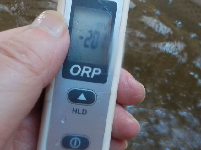 2025/1/11、19時20分~40分、浴槽内でORP計測。源泉(冬季加温)掛け流しで、塩素系薬剤未使用。