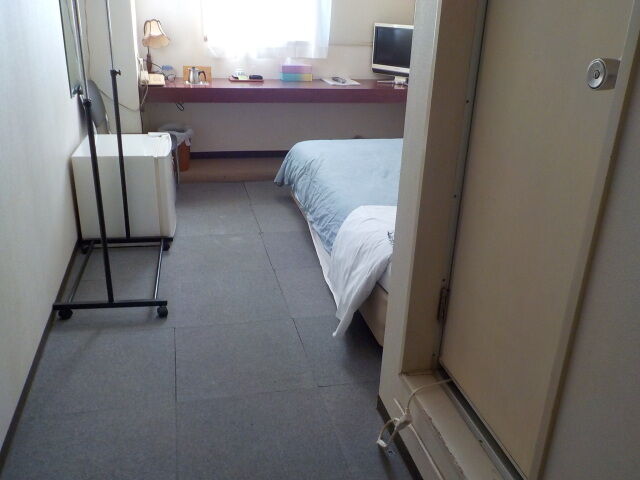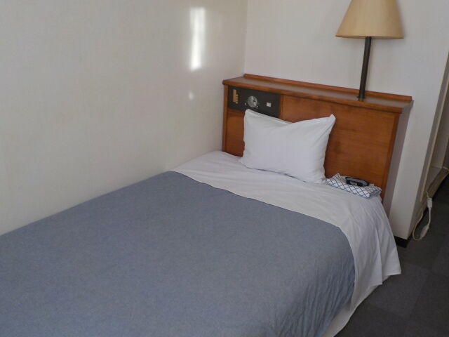 案内されたのは3階のシングルルーム。旧式のオートロック。壁の差込口にキーホルダーを差し込むと照明が点灯する。客室は喫煙可なので煙草の臭いがする。