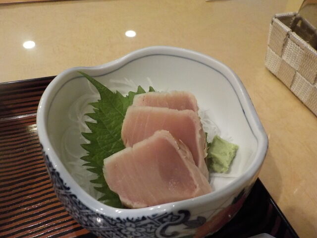 夕食は定食。豚肉のケチャップ焼き(サラダ付)、刺身、煮物、ご飯、味噌汁、漬物。