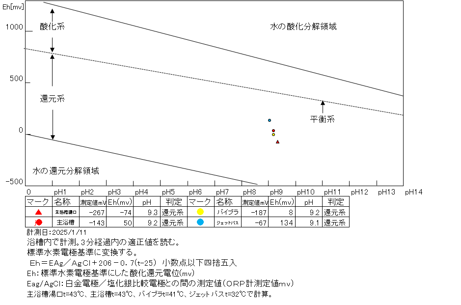 浴槽:温度41.1℃、pH9.15、ORP値は-187mvに収束した。