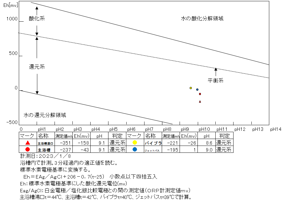 浴槽:温度42.3℃、pH9.14、ORP値は-237mvに収束した。
