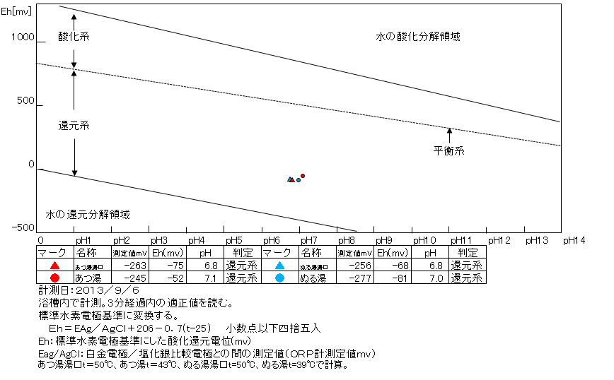 湯口:温度58.0℃、pH6.8、ORP値は-263mvに収束した。