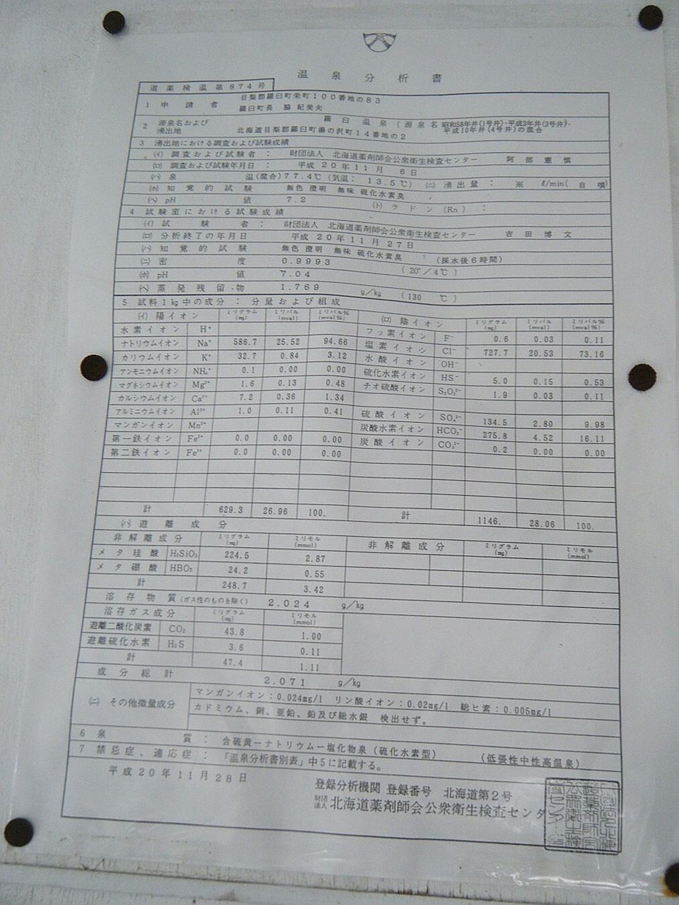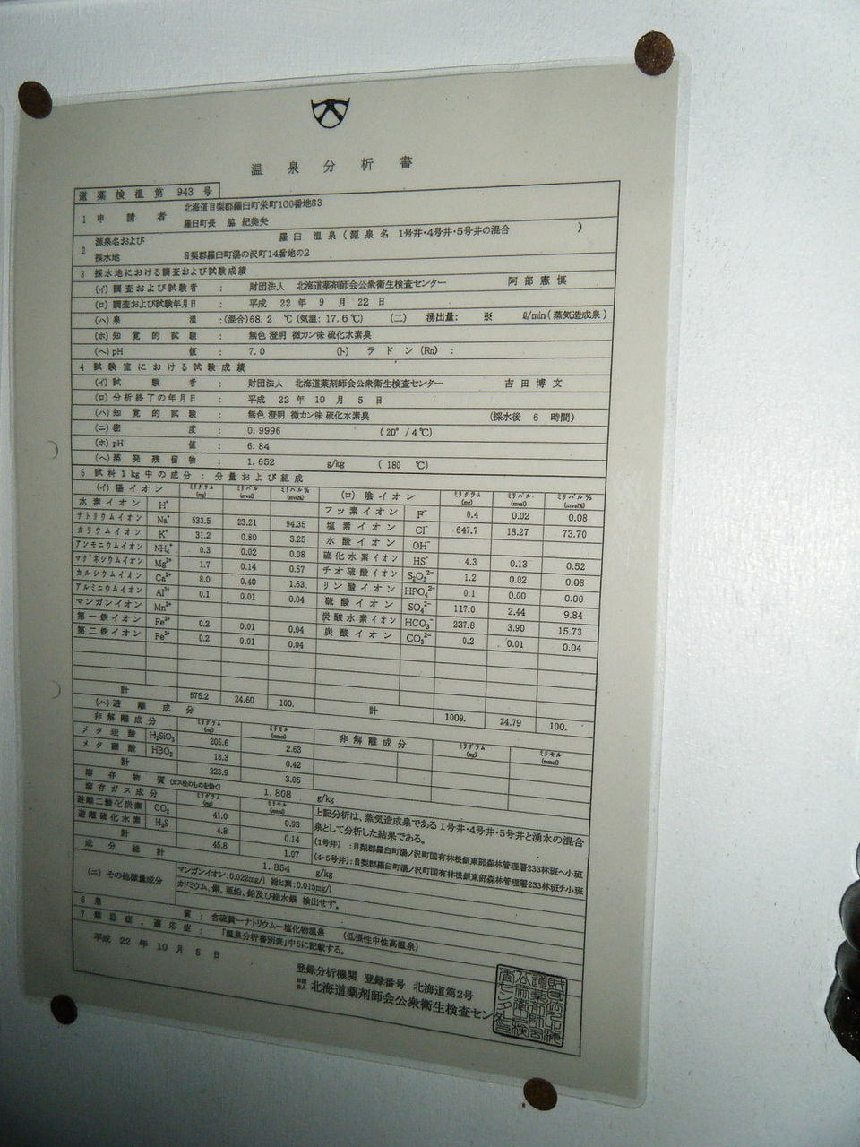 平成22年10月5日に作成した温泉分析書(北海道薬剤師会公衆衛生検査センター)。泉温:(混合68.2℃(平成22年9月22日、気温:17.6℃)、湧出量:※ℓ/分(蒸気造成泉)、pH値:7.0、溶存物質:1.808g/kg、成分総計:1.854g/kg、泉質:含硫黄-ナトリウム-塩化物泉(低張性中性高温泉)(旧泉質名:含食塩-硫黄泉)