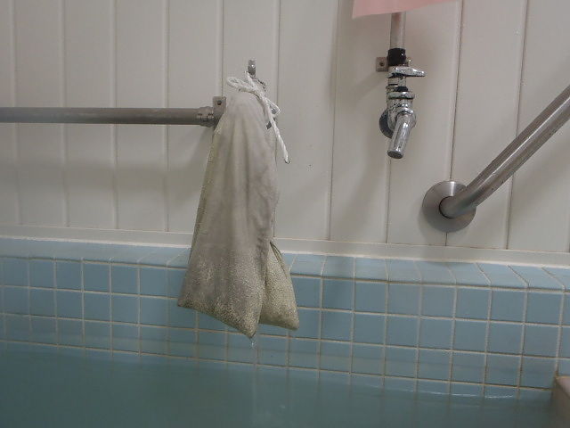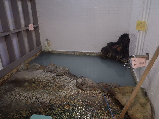 微乳白濁のぬるめの湯。布袋を被せた湯口と加水蛇口併設。注湯量は数ℓ/分。知覚的には、硫化水素臭、塩味。営業中は加水していないが、湯客が加水する可能性あり。源泉(加水)掛け流しと追認。つるすべの浴感で長湯に向いている。