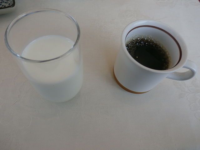 朝食は和定食。納豆・海苔・牛乳・コーヒーはセルフサービス