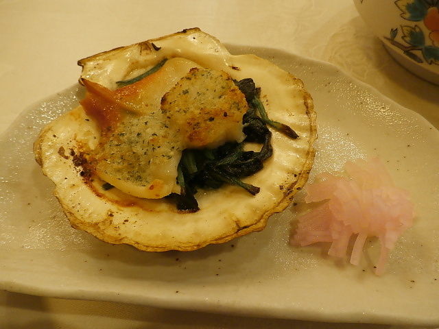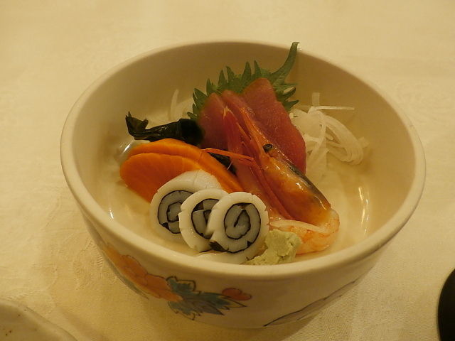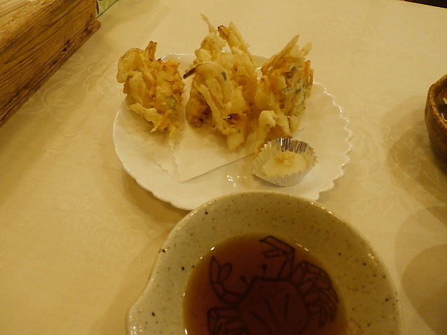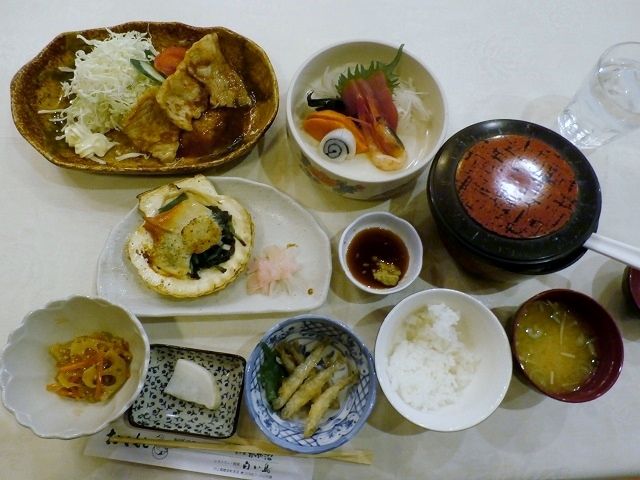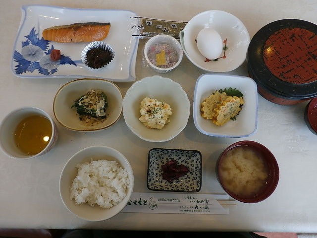 夕食は、刺身、とり貝のオーブン焼き、わかさぎの天ぷら、豚肉の生姜焼き、かき揚げ天ぷら、小鉢、ご飯お櫃、味噌汁、漬物が付く。2食付きで5000円は安い。ボリュームがあって、中ジョッキ生(550円)で腹一杯になった。