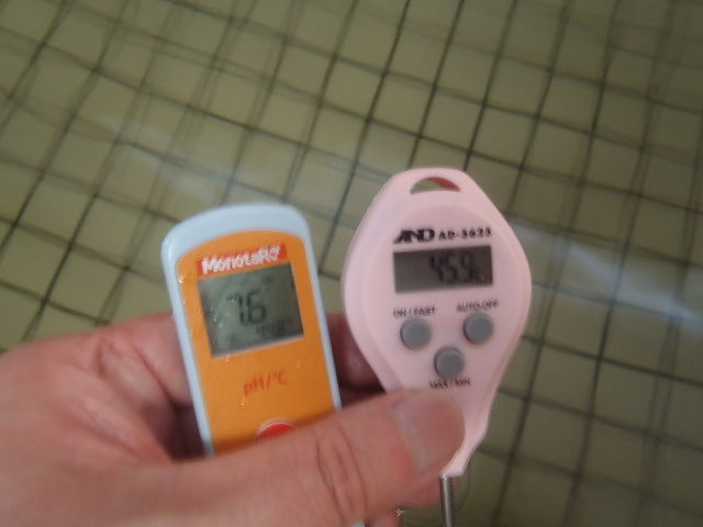浴槽:温度45.9℃、pH値7.6、ORP値は-77mvに収束した。