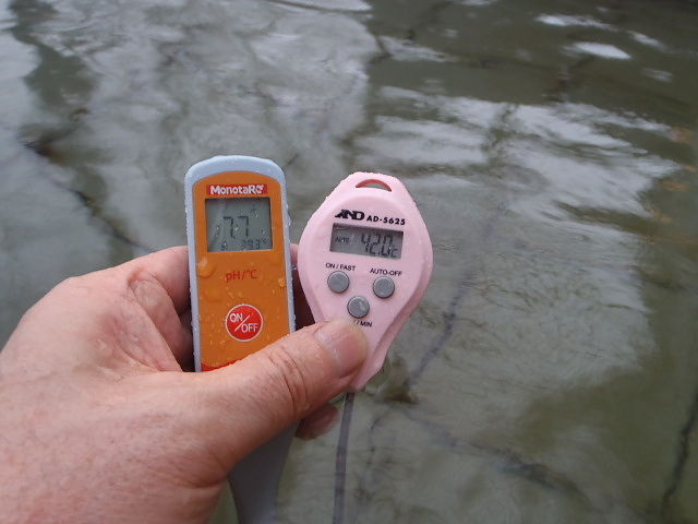湯口:温度41.7℃、pH値7.7、ORP値は-67mvに収束した。