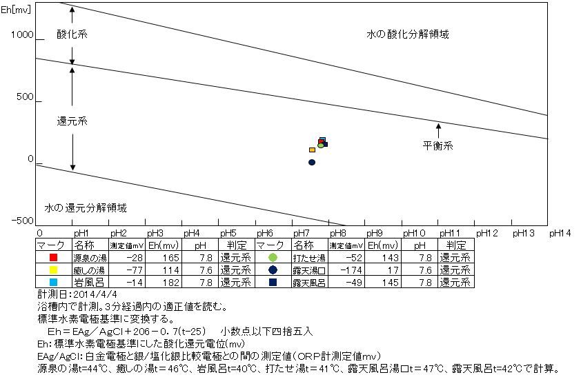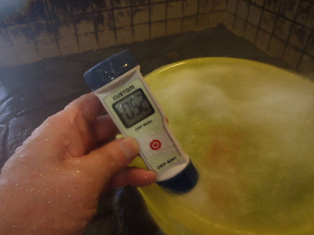 2014/4/4、16時20分~17時、浴槽内でORP計測。源泉100%掛け流しで、塩素系薬剤未使用。
