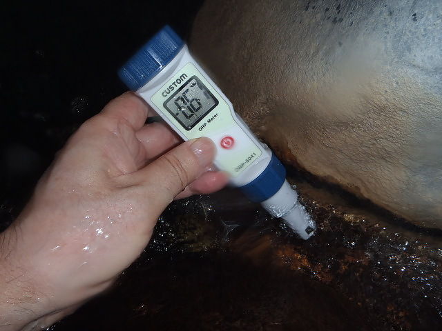湯口:温度46.8℃、pH値7.6、ORP値は-174mvに収束した。