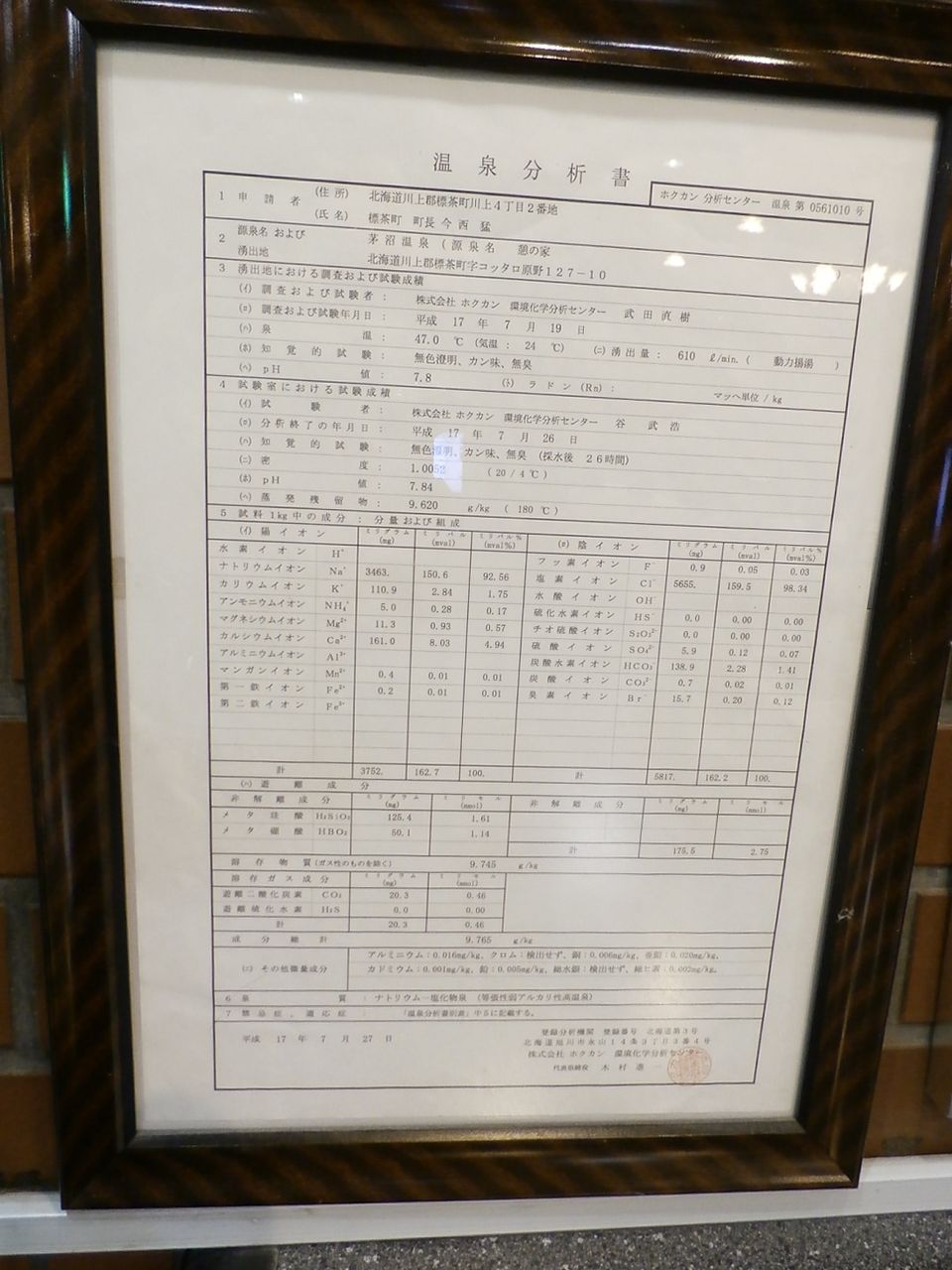 平成17年7月27日に作成した温泉分析書(ホクカン環境化学分析センター)。泉温:47.0℃(気温:24℃)、pH:7.8、湧出量:610ℓ/分(動力揚湯)、溶存物質:9.745g/kg、成分総計:9.765g/kg、泉質:ナトリウム-塩化物泉(等張性弱アルカリ性高温泉)(旧泉質名:食塩泉)