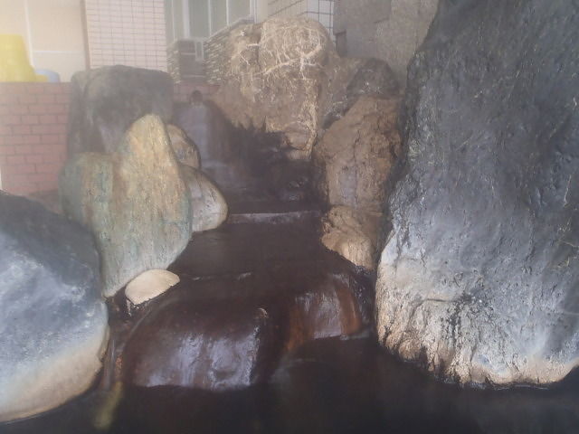 岩を配したほぼ無色透明の湯。湯口から約30ℓ/ほど滝状に流れている。知覚的には、ほとんど無臭、塩味。溢れた湯は湯縁からオーバーフローしている。壁面に源泉100%の掲示があって紛らわしいが、加水掛け流しと査定。丁度良い湯加減である。