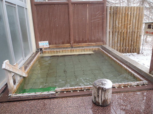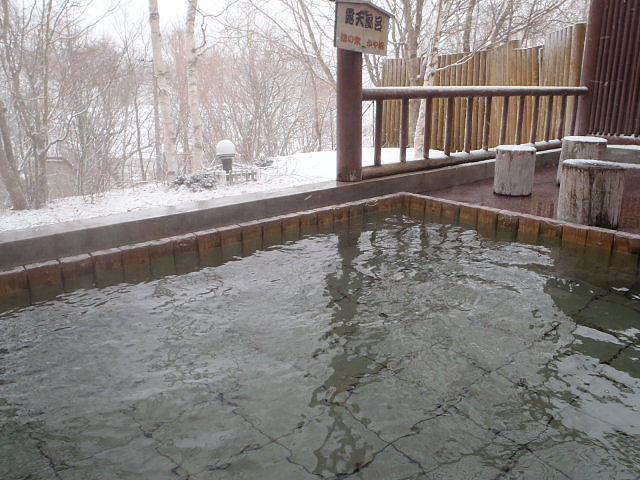 深夜から雨が雪に変わる。雪景色の中、木々の隙間からシラルトロ湖を望める。檜の丸太で造った露天風呂。湯はほぼ無色透明。湯口から約30ℓ/分注いでいる。知覚的には、微弱モール臭、塩味。溢れた湯は湯中の排湯管から排湯している。