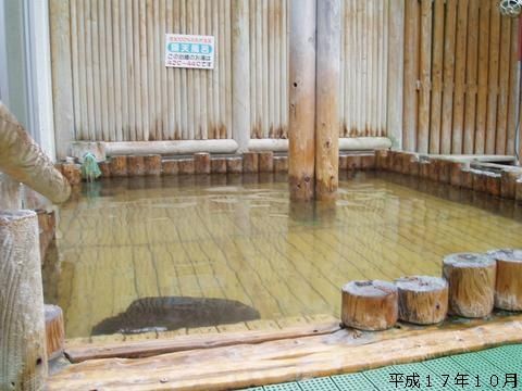 平成17年10月当時の露天風呂は床が板張りで、丸太の柱が立っていた。