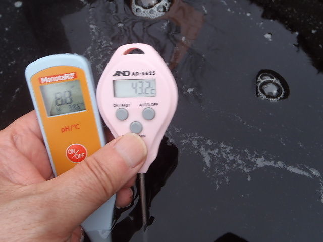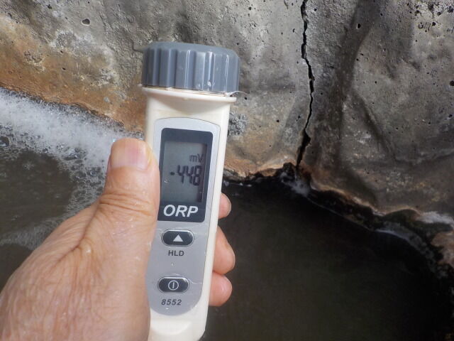 湯口:温度42.3℃、pH8.53、ORP値は-420mvに収束した。