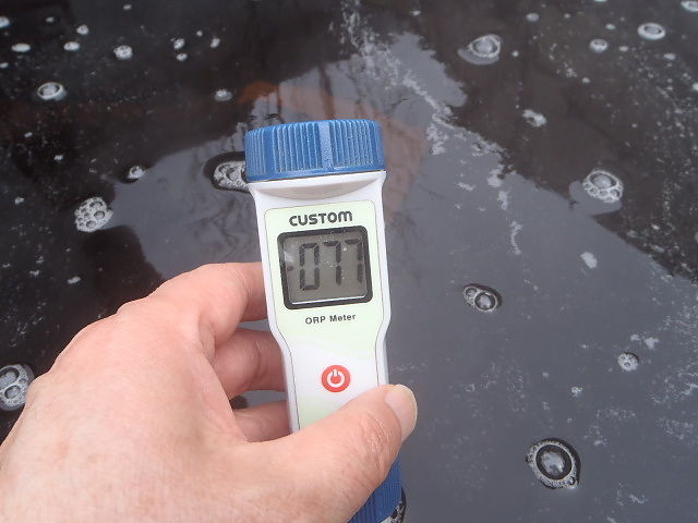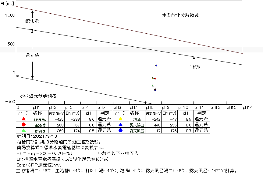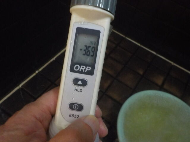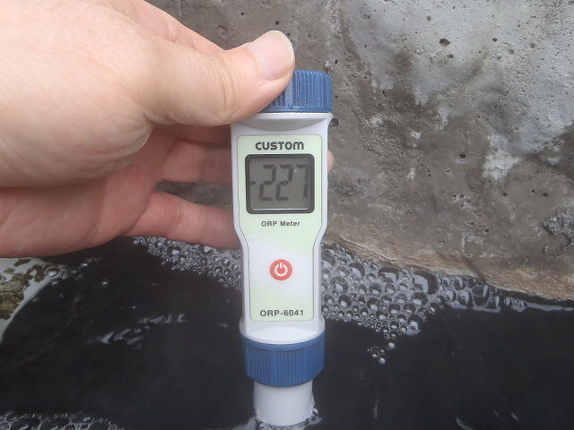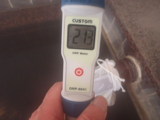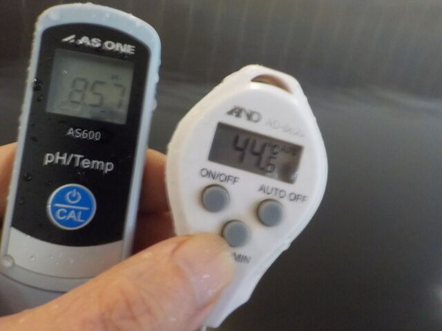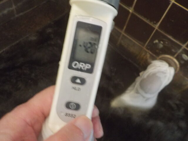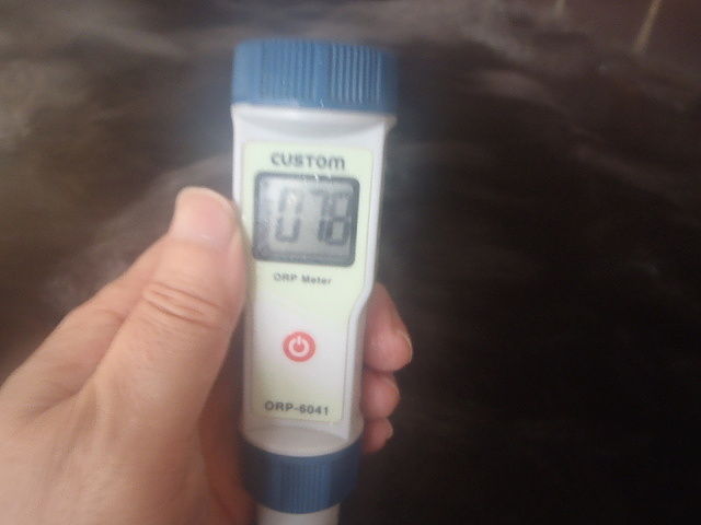 浴槽:温度44.6℃、pH8.57、ORP値は-183mvに収束した。