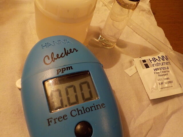 2021/9/13、20時40分頃、主浴槽から試料をミニボトルで採水し、遊離残留塩素測定器で遊離残留塩素濃度を測定。