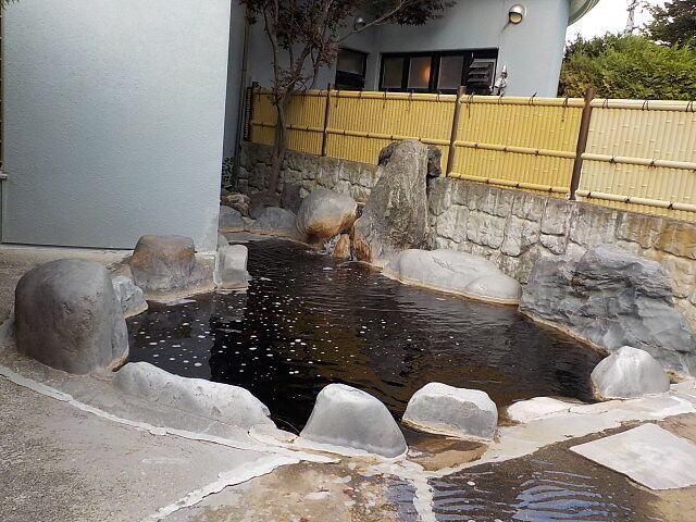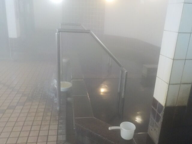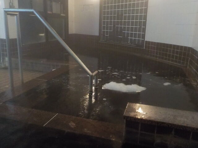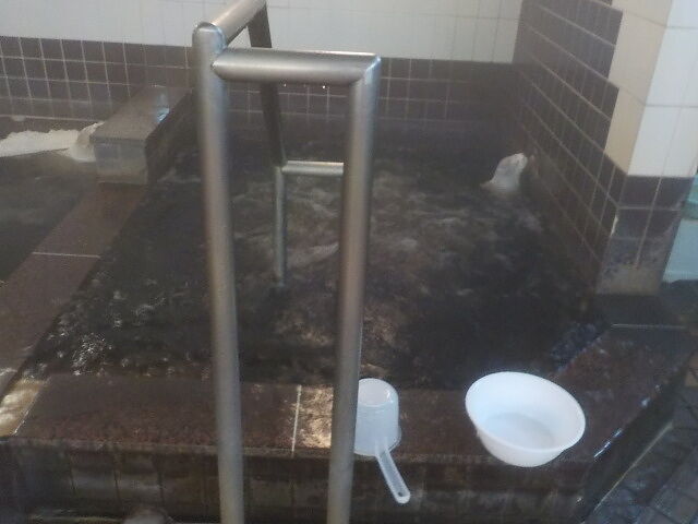 黒湯に近いコーラ色不透明の湯。湯底から泡立っている。21時30分~8時の間はバイブラ装置は稼働していない。布袋を被せた湯口から約20ℓ/分注湯。知覚的には主浴槽に準ずる。溢れた湯は湯縁からオーバーフローしている。