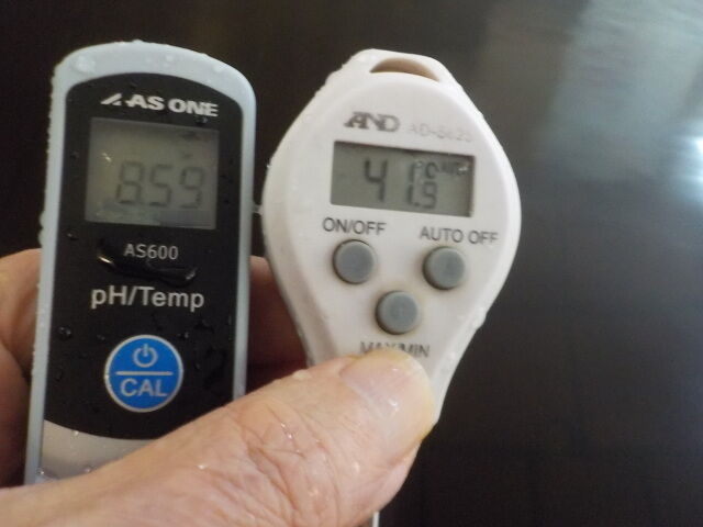 浴槽:温度41.9℃、pH8.59、ORP値は-160mvに収束した。