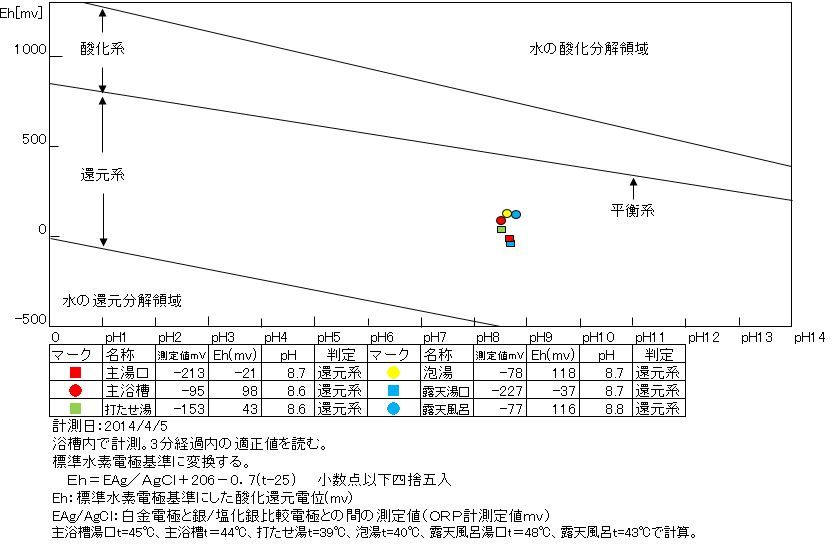 2014/4/5、10時20分~40分、浴槽内でORP計測(湯口はミニボトルで採水)。源泉(加水)掛け流しで、塩素系薬剤未使用。