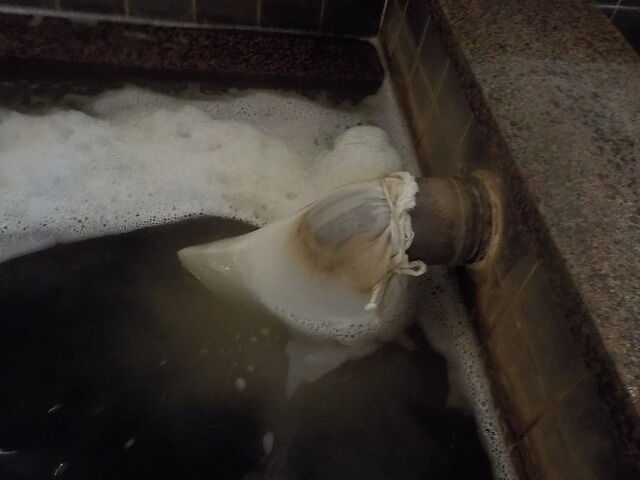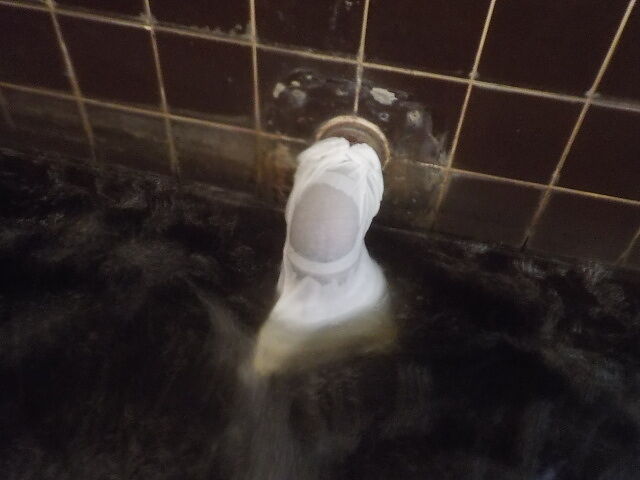 黒湯に近いコーラ色不透明の湯。布袋を被せた湯口から約30ℓ/分注いでいる。知覚的には、モール臭、弱塩味。溢れた湯は湯縁からオーバーフローしている。熱めの湯だが、モール系のぬるりとした浴感あり。