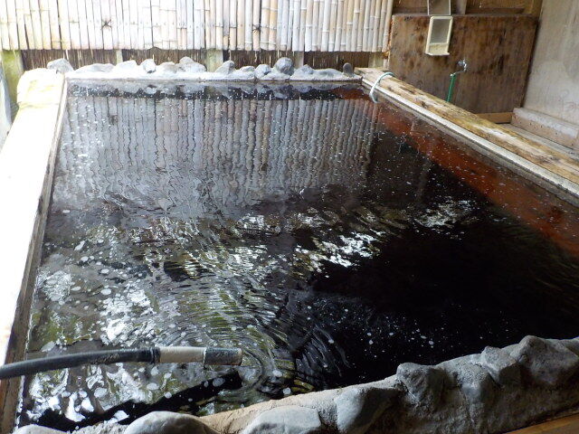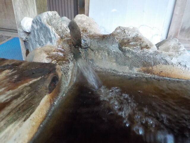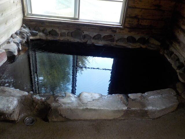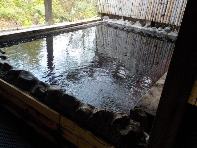 こじんまりした岩風呂にコーヒー色半透明の湯。湯の表面に白い気泡が浮く。湯口から約10ℓ/分注湯。知覚的には、モール臭・たまご臭、微弱塩味。