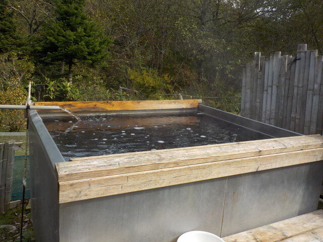 ステンレス製の小さな箱型の浴槽にコーヒー色半透明の湯。注湯量は約10ℓ/分。知覚的には内風呂に準ずる。溢れた湯は排湯口から隣の低温湯に排湯している。自然に包まれた露天風呂はすばらしい。
