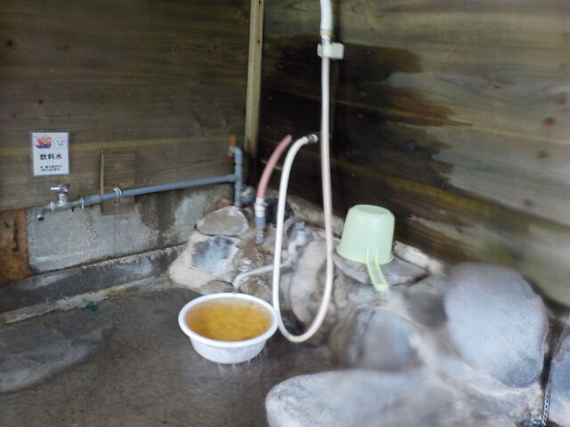内部はステンレス製の浴槽。中温湯の排湯口から湯が流れてくる。ぬるめの湯で長湯に向いている。溢れた湯は犬専用温泉に排湯している。
