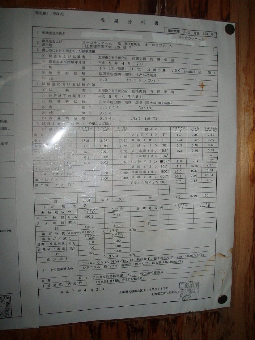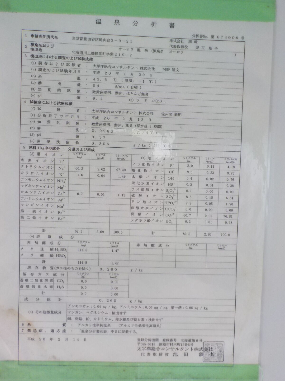 平成20年2月14日作成した温泉分析書(太平洋総合コンサルタント)。泉温:43.6℃(気温:-1℃)、pH値:9.4、湧出量:94ℓ/分(自噴)、溶存物質:0.260g/kg、成分総計:0.260g/kg、泉質:アルカリ性単純温泉(アルカリ性低張性高温泉)(旧泉質名:単純温泉)