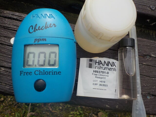 2022/10/6、13時25分頃、男湯・内風呂で試料をミニボトルで採取し、遊離残留塩素測定器で遊離残留塩素濃度を測定。