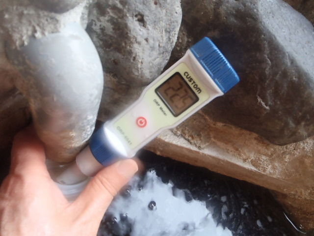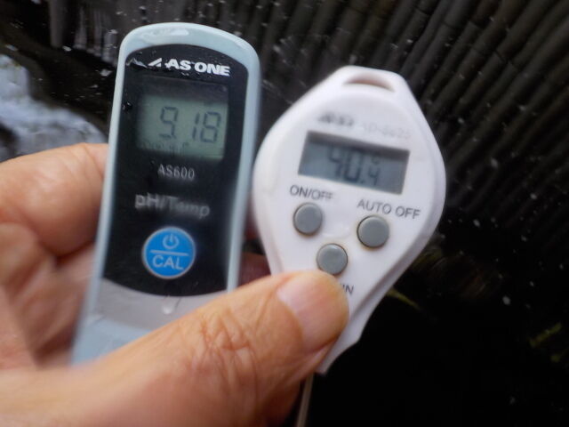 湯口:温度43.5℃、pH9.23、ORP値は-367mvに収束した。