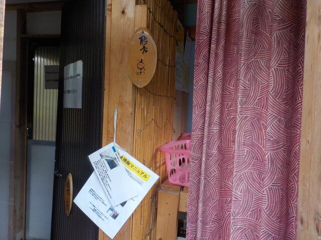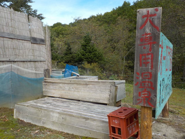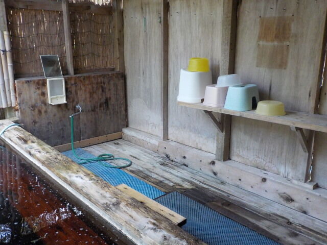 車で温泉棟に向かう。管理棟から約300mの距離に湯小屋が現れる。