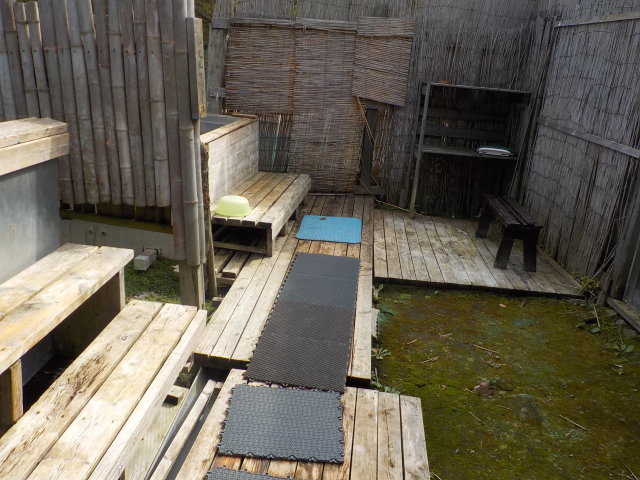 内風呂ドアから露天風呂に出る。露天風呂は中温湯、低温湯の2槽ある。2014年の再湯時、低温湯は空だった。