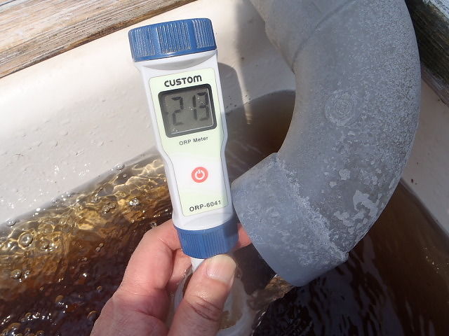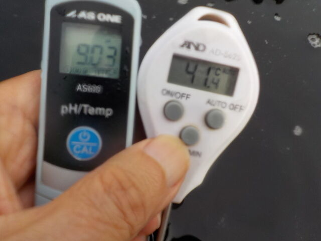 浴槽:温度41.4℃、pH9.03、ORP値は-151mvに収束した。