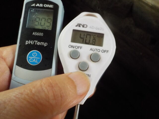 浴槽:温度40.8℃、pH9.09、ORP値は-106mvに収束した。