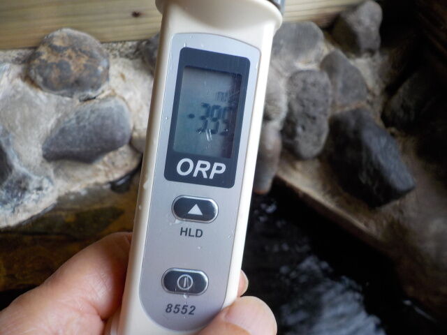 湯口:温度44.1℃、pH9.1、ORP値は-225mvに収束した。