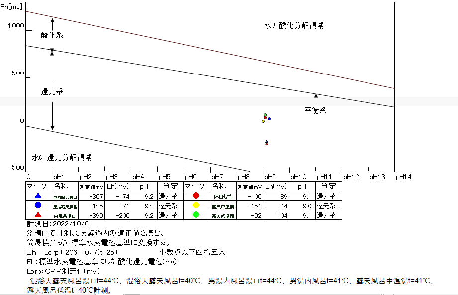 算式を利用して標準水素電極基準に変換してから電位-pH図を作成。Ehは図表の通り。湯口:温度44.2℃、pH9.2、ORP値は-227mvに収束した。