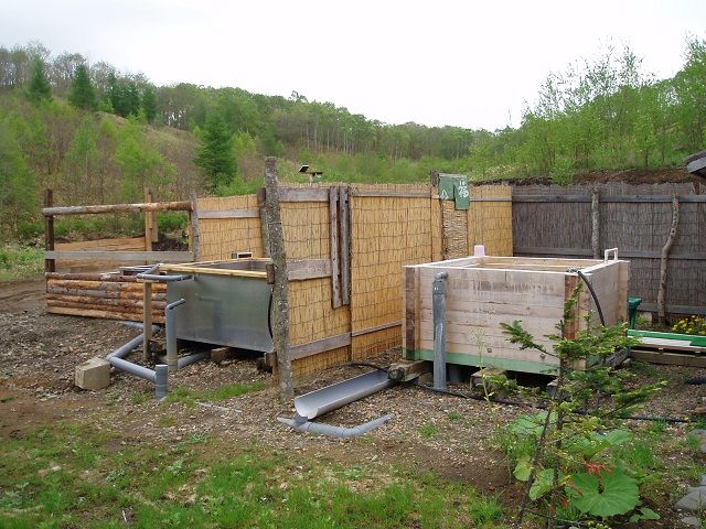 平成18(2006)年5月当時の男女別温泉棟。ログハウス棟の左が男湯内風呂、右が女湯内風呂。