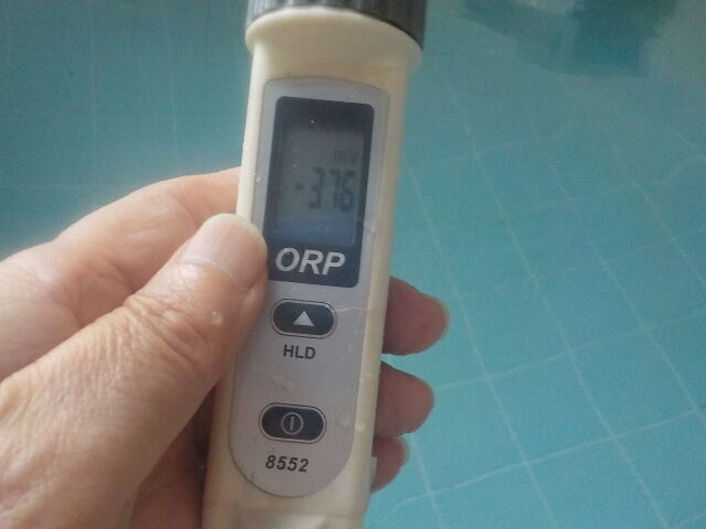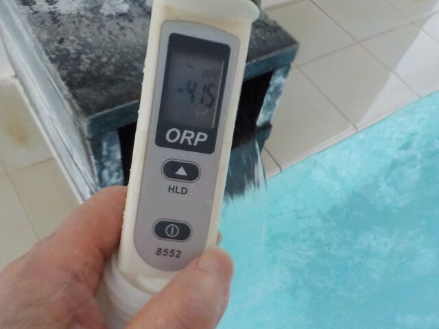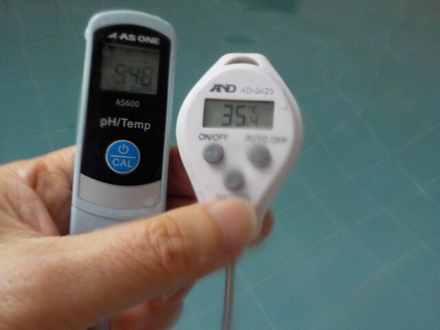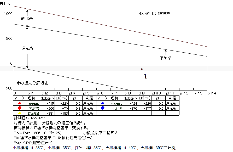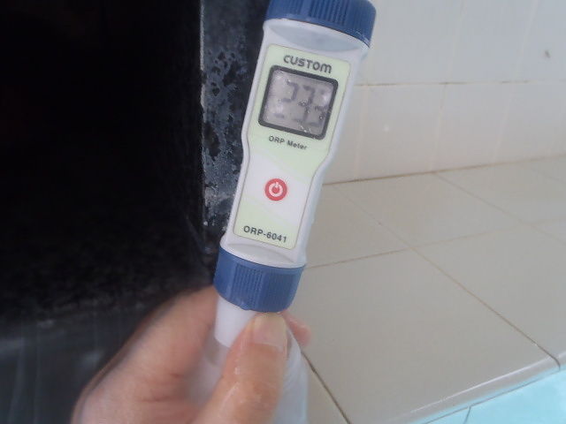 浴槽:温度35.4℃、pH9.48、ORP値は-376mvに収束した。