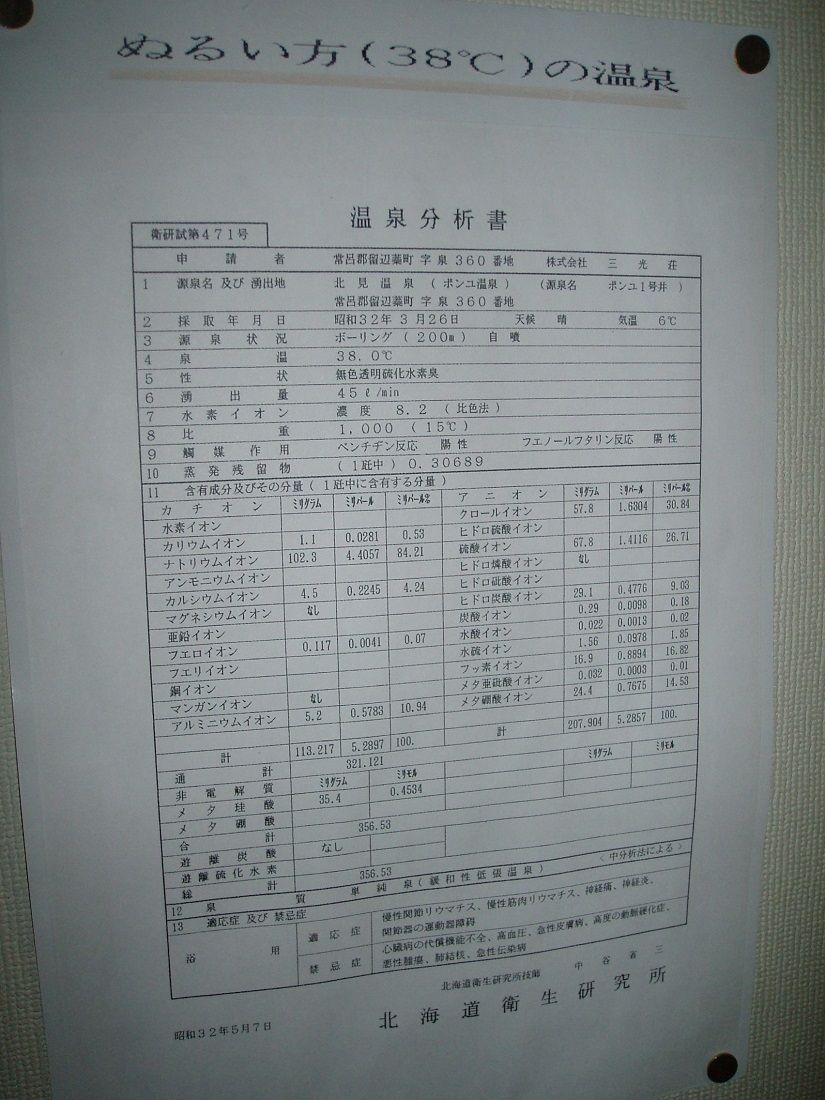 ◇1号井温泉分析書(ぬるい方の温泉、廊下掲示)