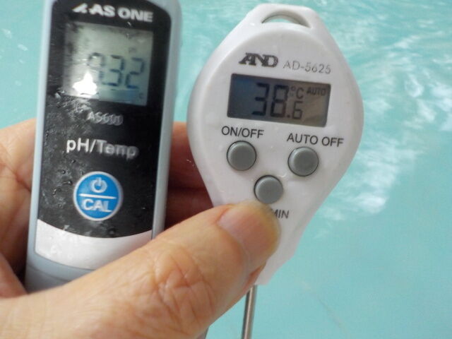 浴槽:温度38.6℃、pH9.32、ORP値は-266mvに収束した。